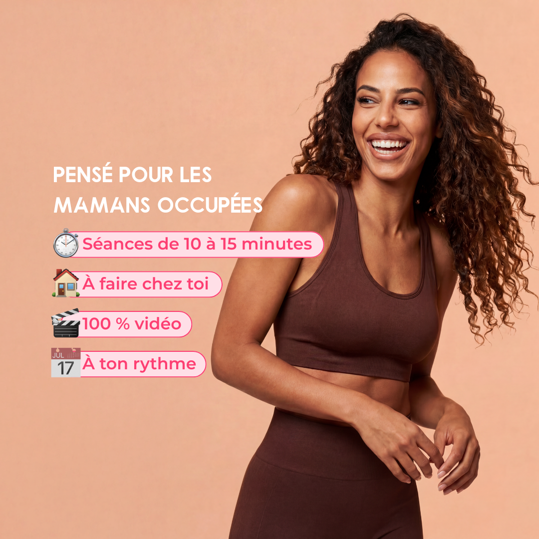 Un programme de 15 minutes par jour, spécialement conçu pour aider les mamans à retrouver un ventre plus plat, renforcer le périnée et soulager les douleurs du dos, en douceur et à leur rythme.