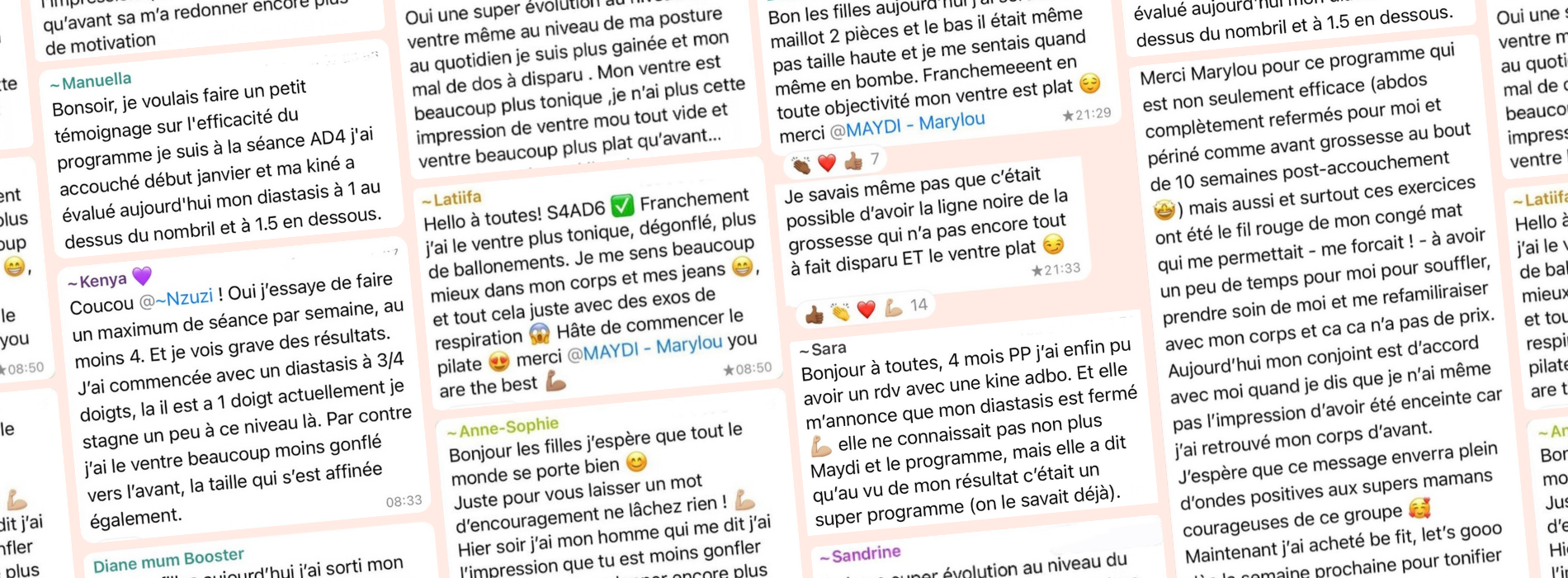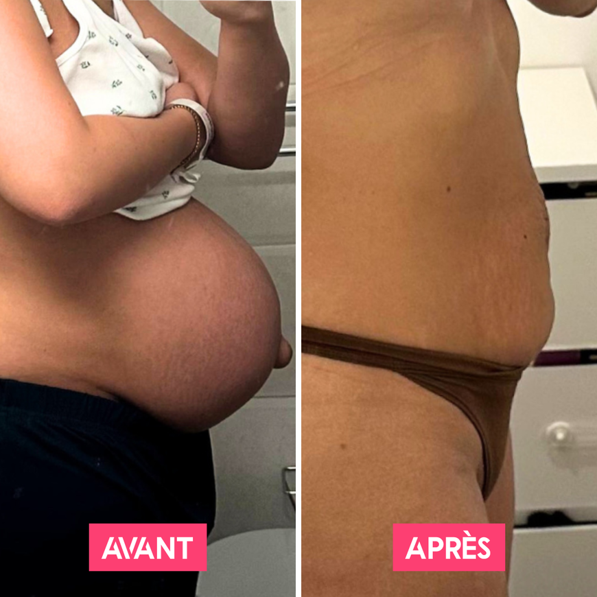 "Après chacune de mes trois césariennes, j’ai fait toutes ces séances dans mon salon, avec mes bébés à côté, et ça m’a transformé physiquement et mentalement. Et c’est exactement pour ça que j’ai créé ce programme pour toi.” — Marylou